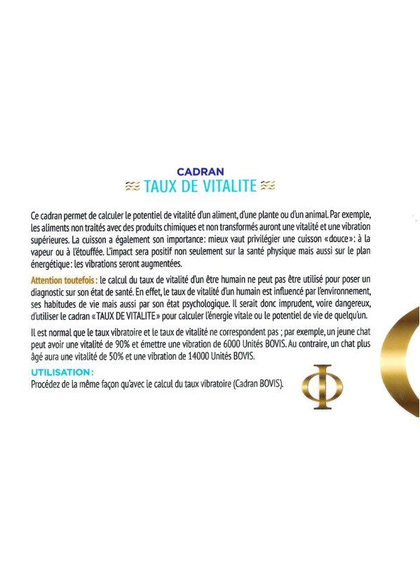 Cadran Taux de vitalité, pour évaluer la qualité énergétique d’un être vivant, d’une plante ou d’un produit.